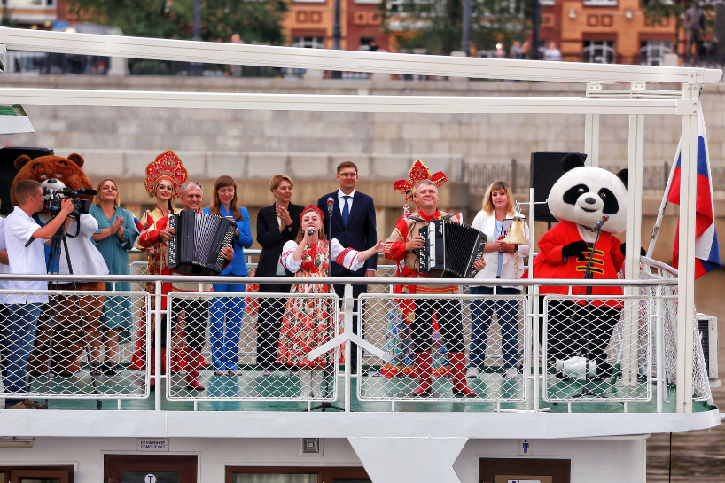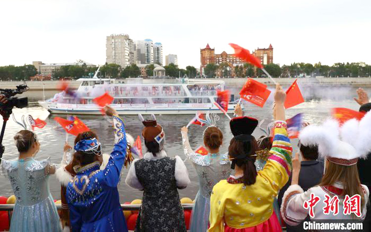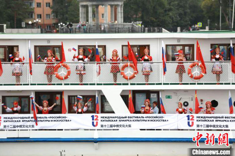 开幕式上,中俄双方船只停泊在界江之上。中俄艺术家和小朋友联袂呈现《美在黑龙江》《喀秋莎》《友谊之河》等精彩节目,他们各自身着中华民族服饰、俄罗斯民族服饰,以音乐舞蹈艺术传递民间友谊。(图片来源:中新网)