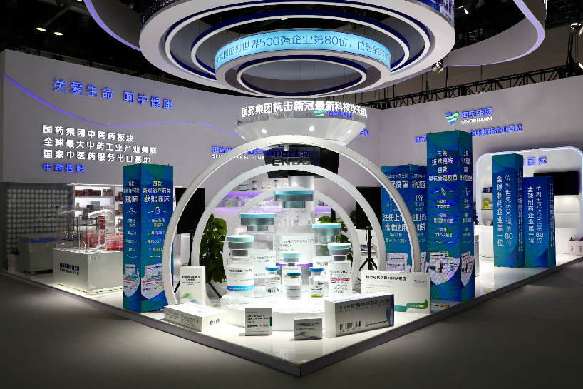 媒体记者前往探访服贸会国家会议中心展区。图为国药集团展区。(图片来源:中新社)