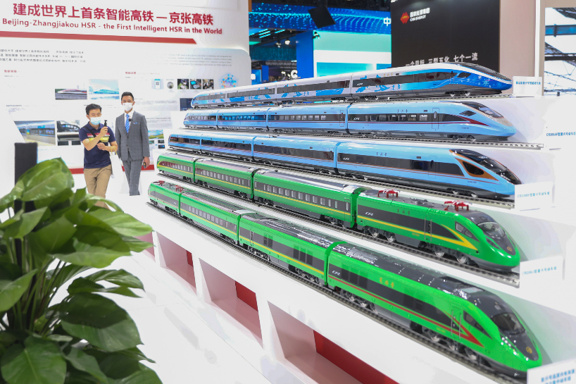 中国铁路展区展出的不同型号的动车组模型。(图片来源:中新社)