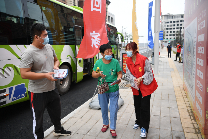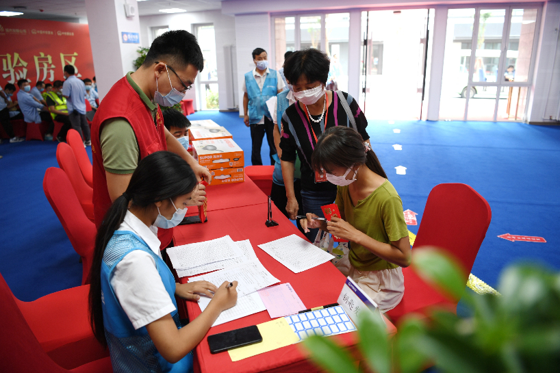 回迁居民(中)在雄安新区雄东片区A单元安置房交付点向志愿者咨询交付事宜。(图片来源:新华社)