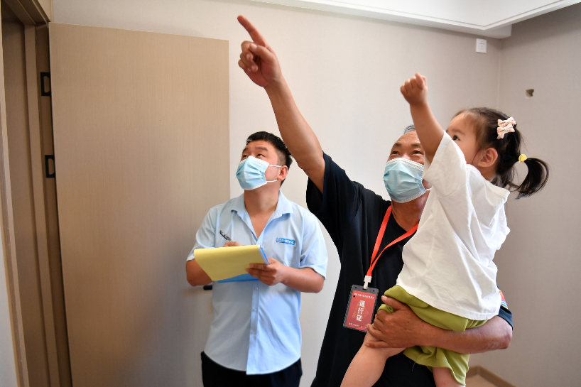 中建二局河北分公司工作人员与回迁居民进行验房。(图片来源:中新社)
