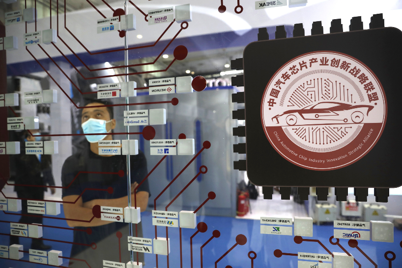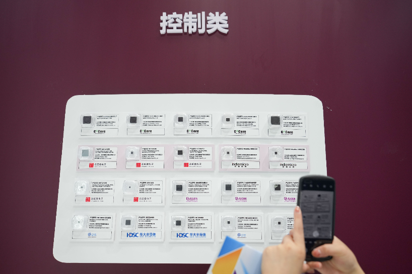 观众在北京展场优秀国产汽车芯片展区参观。(图片来源:中新社)