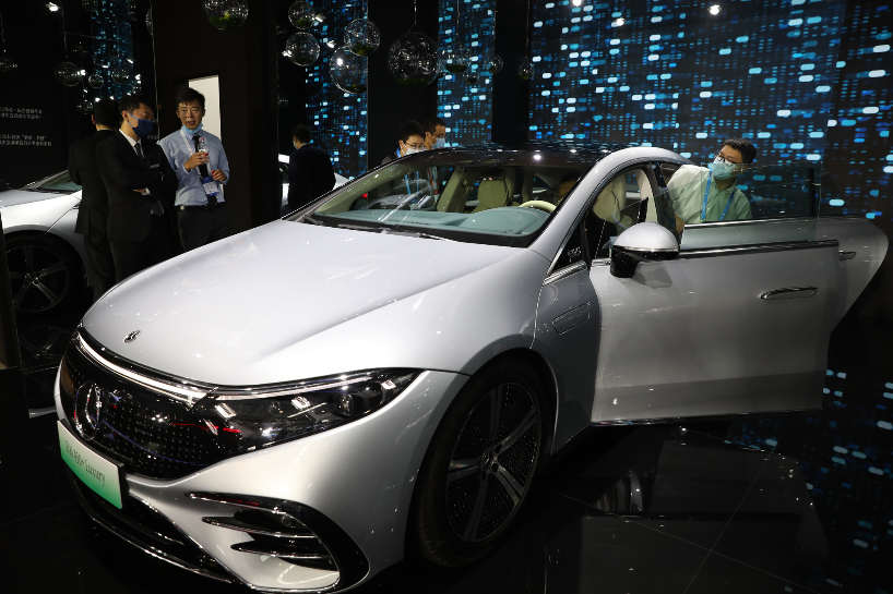 观众在北京展场奔驰汽车展台参观体验。(图片来源:中新社)