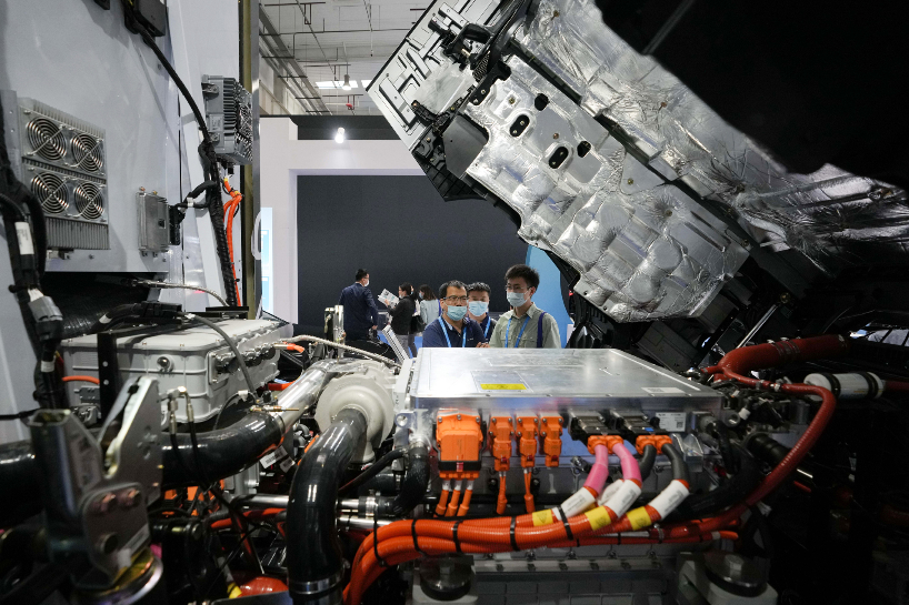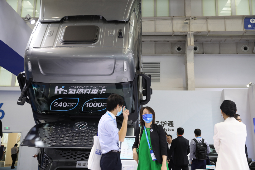 参观者在参观展出的一款氢燃料重卡产品。(图片来源:新华社)