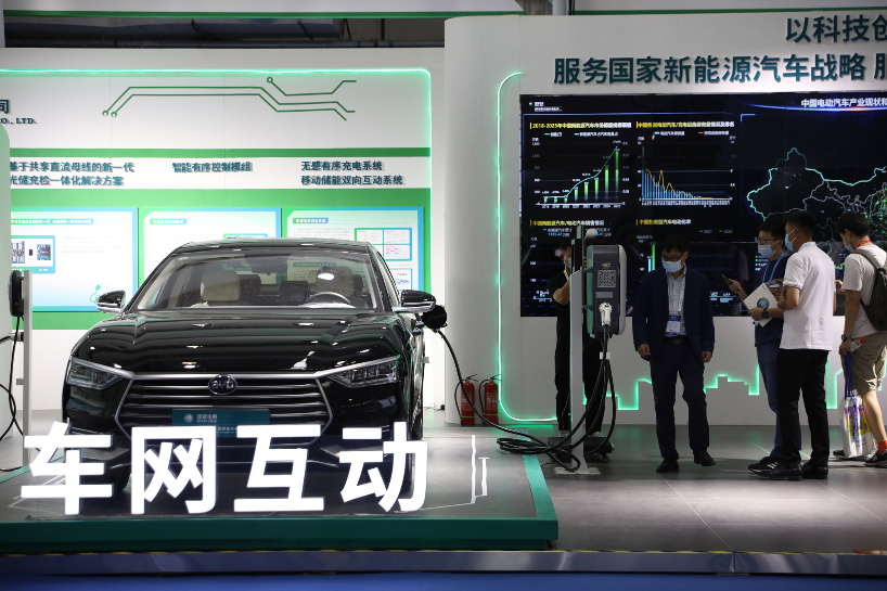观众在北京展场国家电网有限公司车网互动展台参观。(图片来源:中新社)