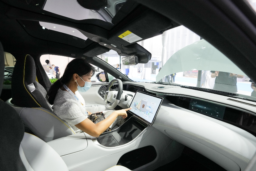 8月26日,参观者在体验一台新能源汽车。(图片来源:新华社)