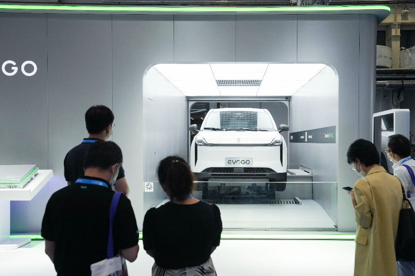 参观者在观看一台可换电池新能源汽车的换电演示。(图片来源:新华社)
