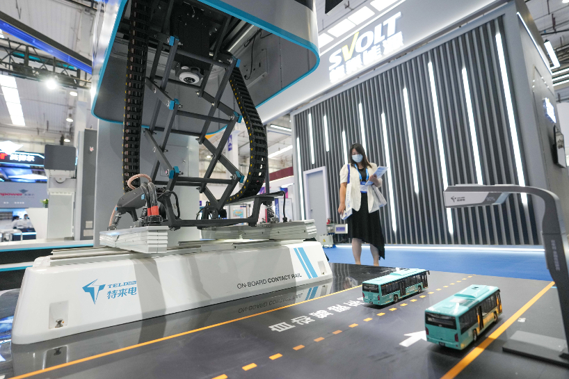 一位参观者在参观一款面向无人驾驶自动客车的柔性充电弓。(图片来源:新华社)