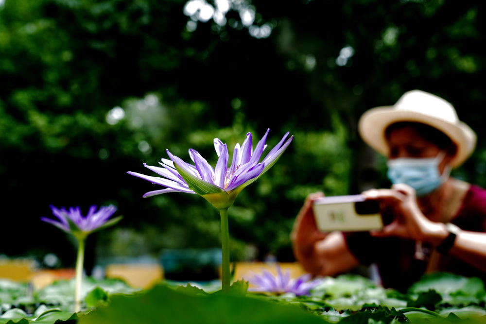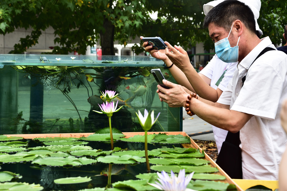 2022年8月28日,市民在花影鱼跃区里拍摄睡莲。(图片来源:中新社)