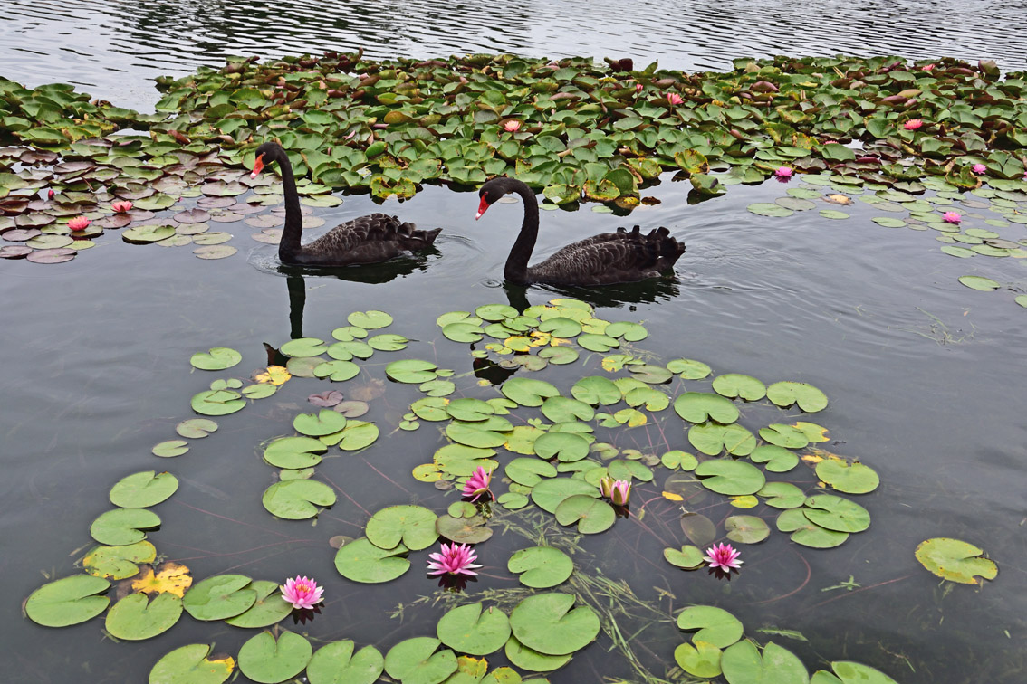 2022年8月28日,上海辰山植物园举办的“静谧的睡莲世界”展览,睡莲和黑天鹅同框。(图片来源:中新社)