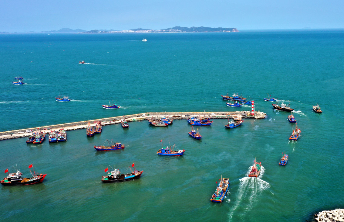 9月1日,在青岛西海岸新区积米崖码头,渔船陆续出海。(图片来源:新华社)