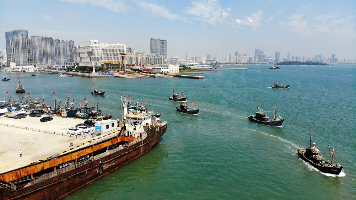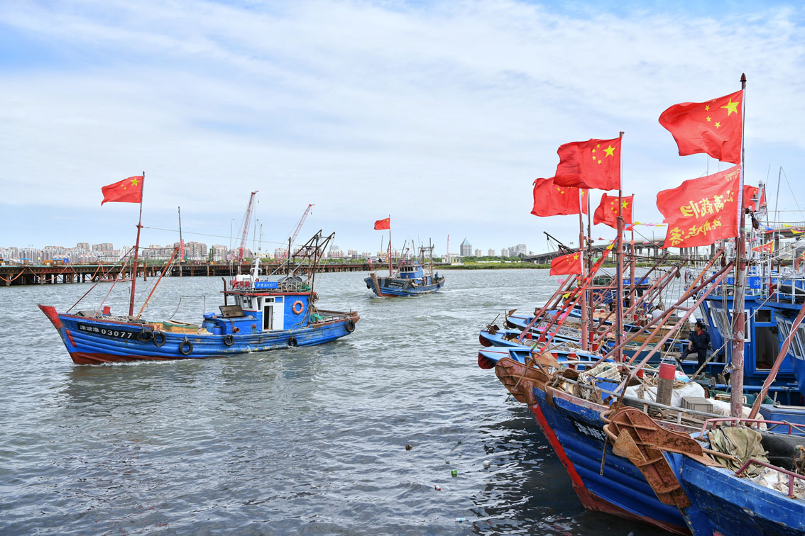 9月1日,天津滨海新区北塘渔港码头,渔船有序离港出海。当天,为期4个月的渤海伏季休渔期全面结束,天津滨海新区200多条渔船下海秋捕。