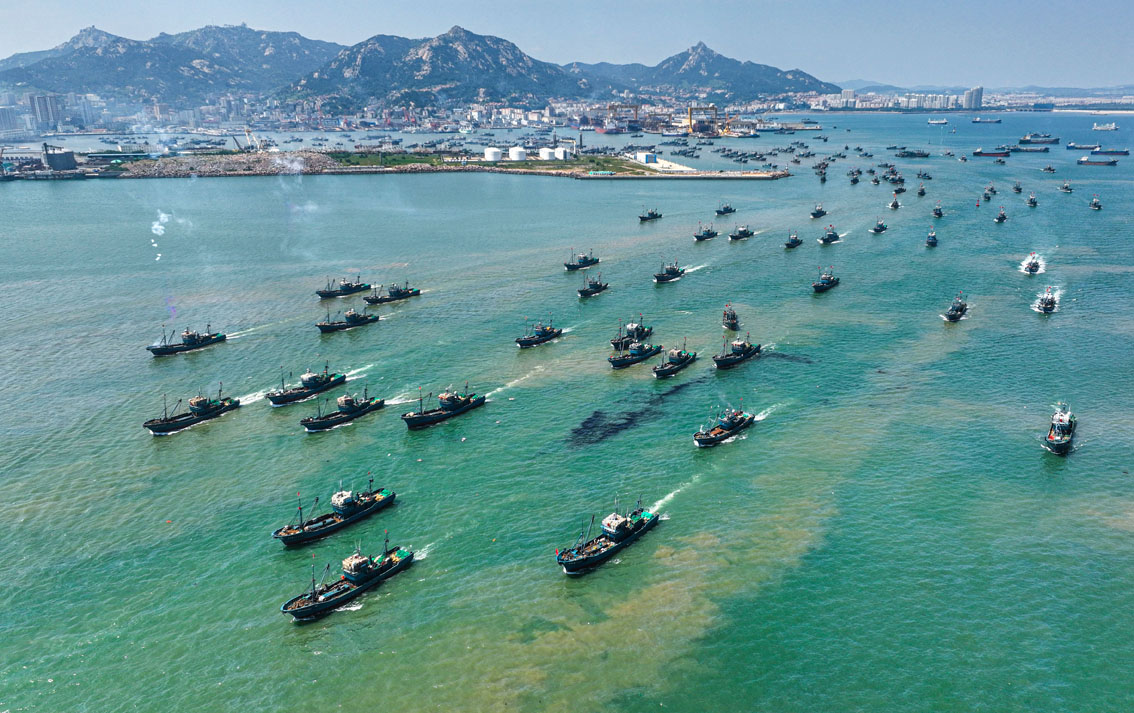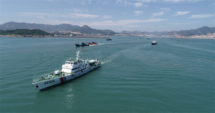 9月1日,青岛各码头渔船在青岛海警局舰艇的护航下,千帆竞出奔赴不同渔区捕捞作业。(图片来源:人民网)