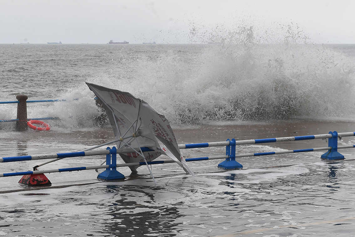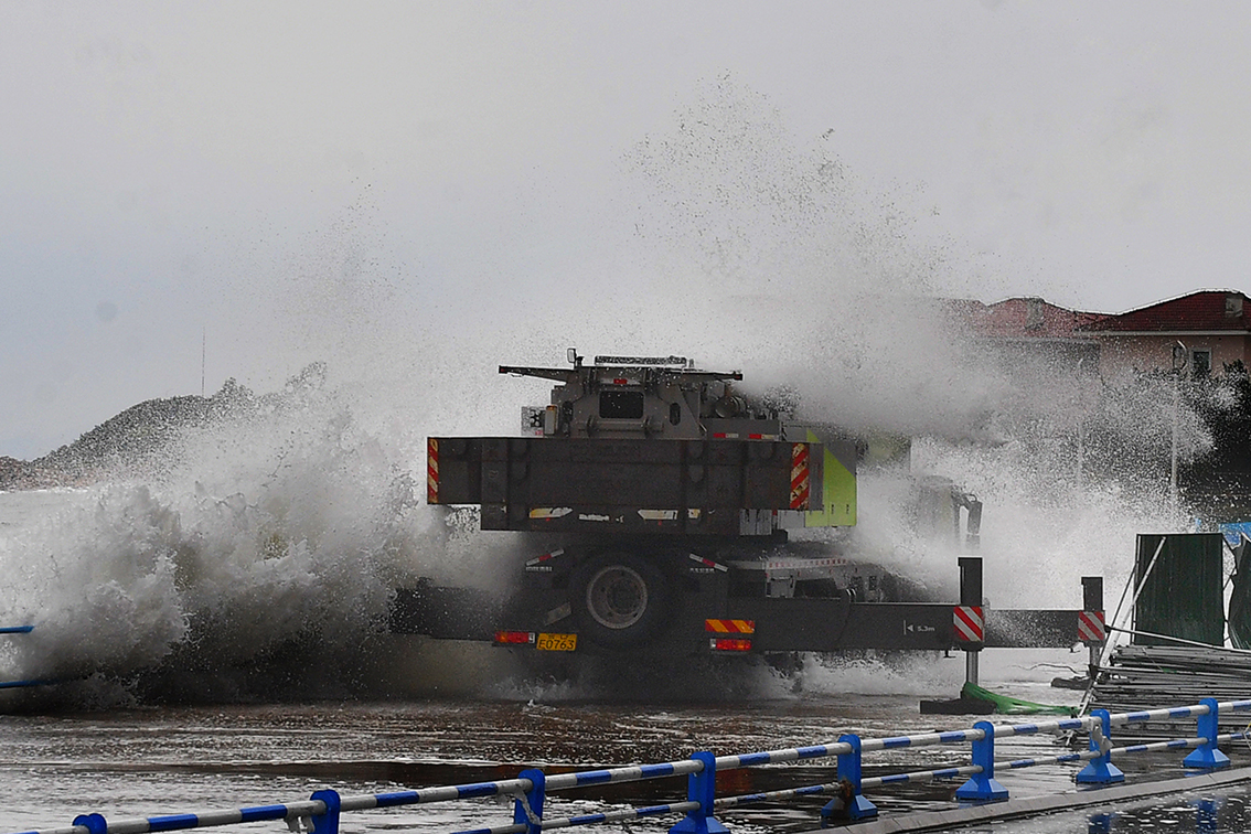 2022年9月5日,山东省青岛市沿海一带,台风掀起巨浪冲击路边停放的工程车。