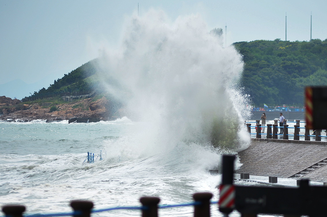 2022年9月5日,山东省青岛市,受台风“轩岚诺”影响,沿海一带掀起十几米高巨浪。