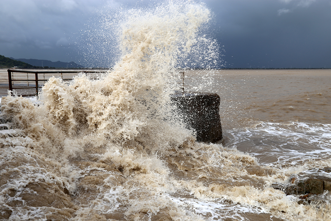2022年9月4日下午,受今年第11号超强台风“轩岚诺”逼近的影响,浙江温岭市城南镇海域,奔涌的潮水拍打海堤激起巨浪,场面蔚为壮观。