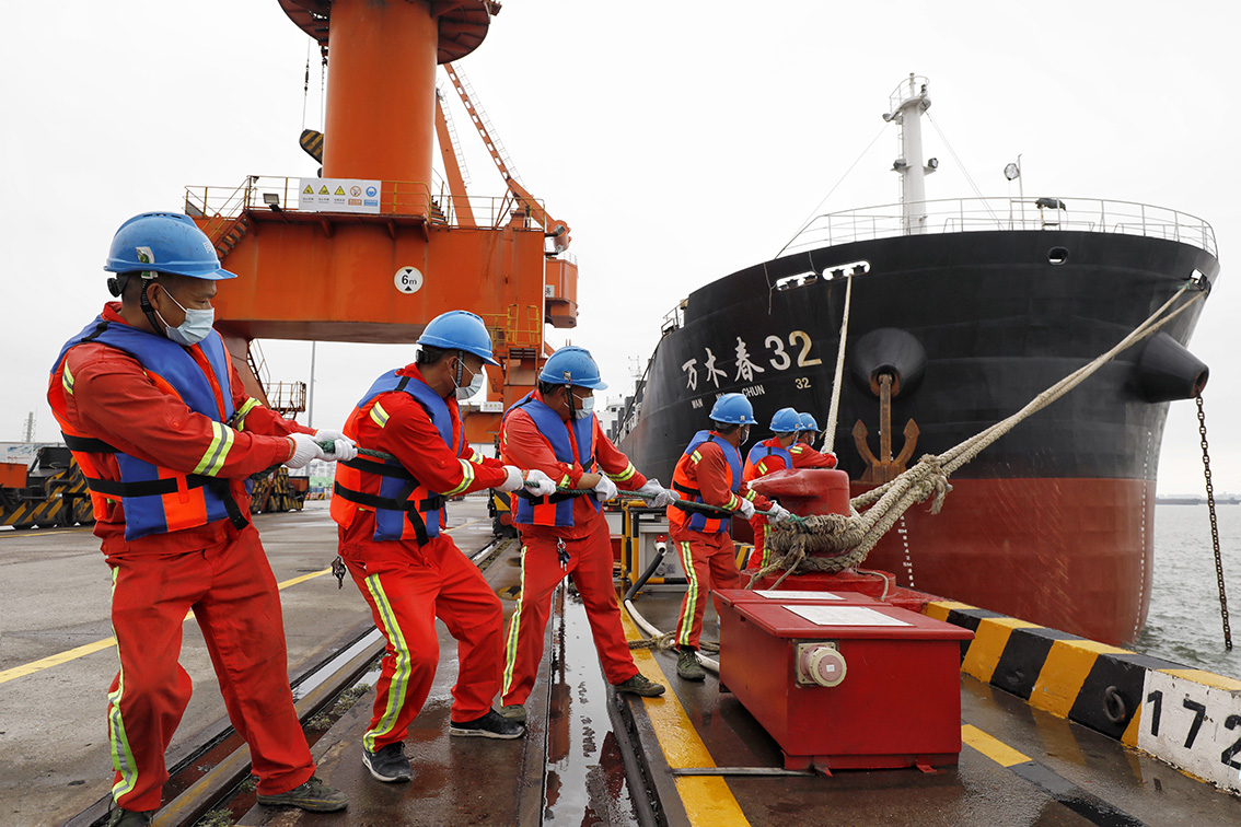 2022年9月4日,江苏省张家港保税科技(集团)股份有限公司员工对停靠码头的船舶进行带缆加固。受第11号强台风“轩岚诺”影响,江苏东南部地区有中雨,局部大到暴雨,江苏启动防台风Ⅳ级应急响应。