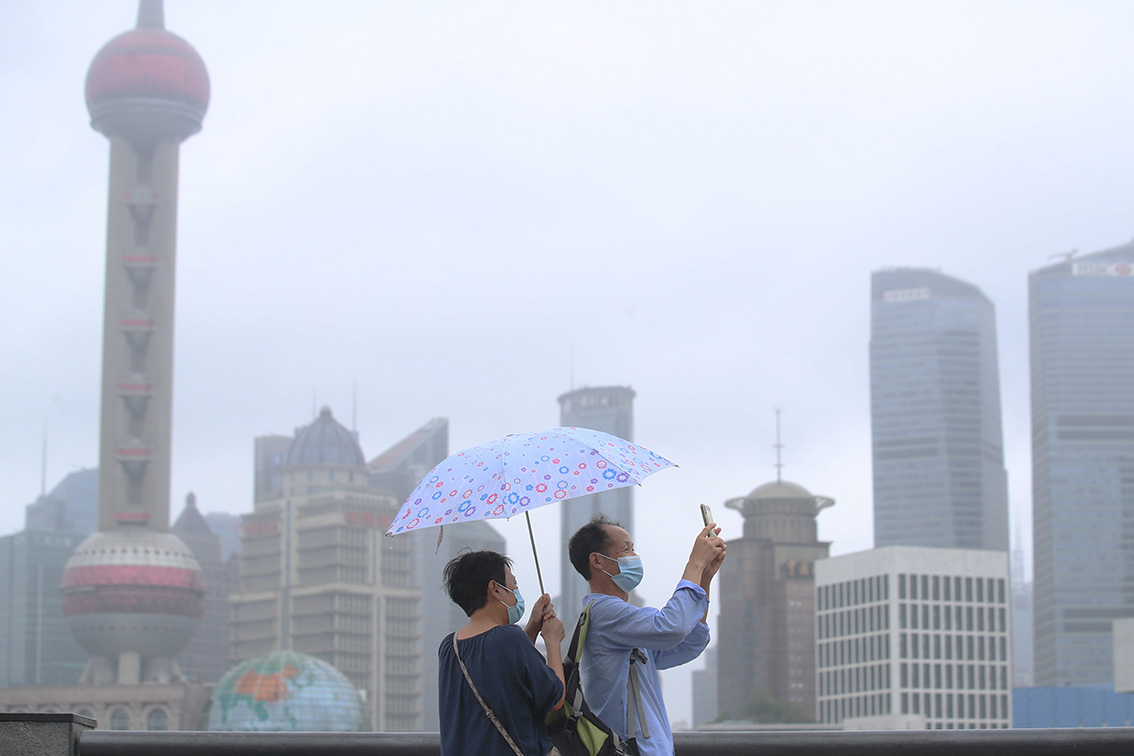 9月5日,上海,游客冒雨在外滩游览。据上海市气象局消息,当日15时,台风“轩岚诺”位于上海偏东方向约358公里的海面上(北纬31.3度,东经125.7度),已越过上海同纬度。
