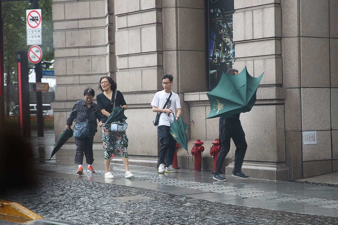 9月5日,上海,游客在路边躲避风雨。据上海市气象局消息,当日15时,台风“轩岚诺”位于上海偏东方向约358公里的海面上(北纬31.3度,东经125.7度),已越过上海同纬度。