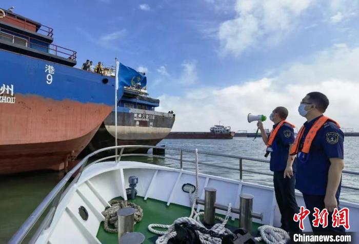 9月5日,超强台风“轩岚诺”外围云系影响到长三角地区,长江下游区域争分夺秒撤离人员、船舶。图为海事工作人员向船舶喊话。(图片来源:中新网)