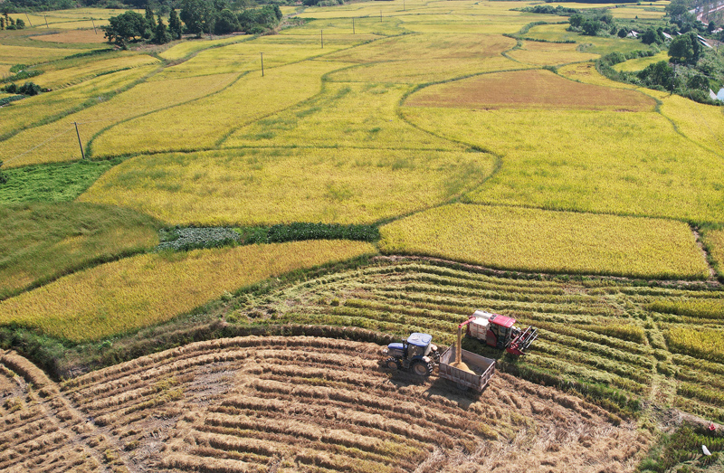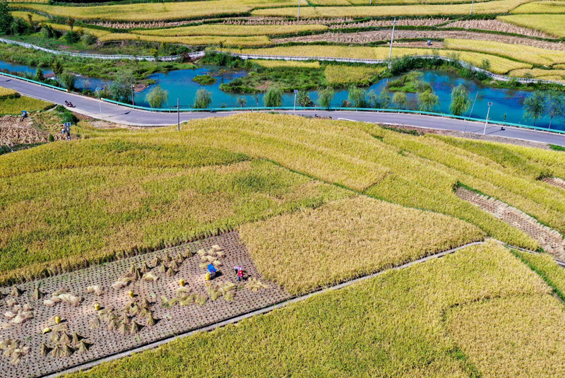 9月6日,贵州省铜仁市玉屏侗族自治县朱家场镇混寨村的村民在收获稻谷(无人机照片)。(图片来源:新华社)