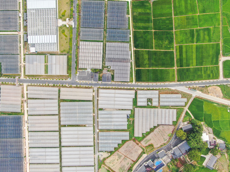 航拍地处江西九江修水县的何市镇农业产业示范园火石村片区,千亩设施农业大棚整齐划一分布在田野之上。(图片来源:中新社)