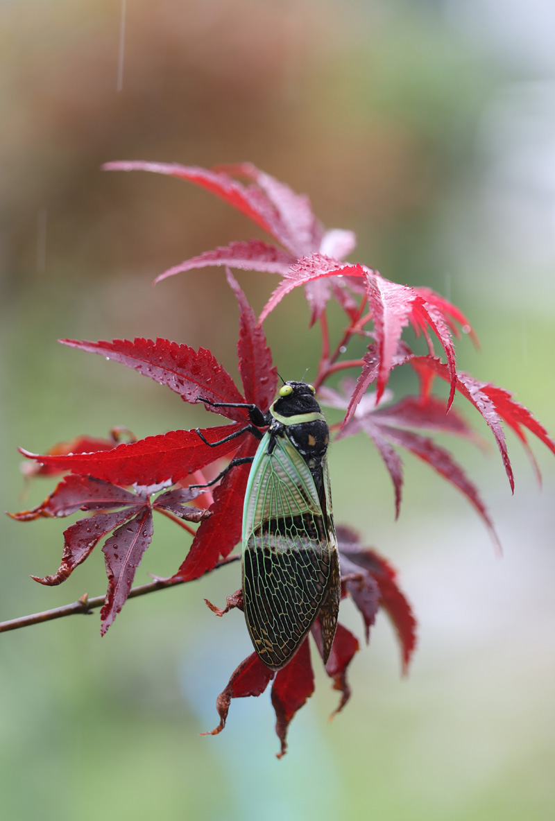 9月4日,在云南省怒江州贡山县独龙江公路旁,一只蝉躲在发红的枫叶下。(图片来源:新华社)