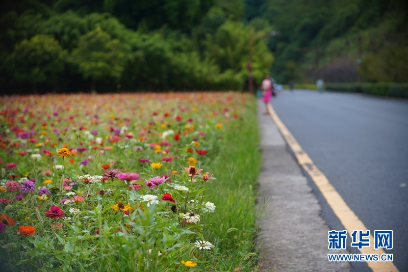8月31日,乐山市绿心公园毛家湾花田白色、红色、黄色等花儿竞相开放,五彩斑斓。图为公路旁的花田。(图片来源:新华网)