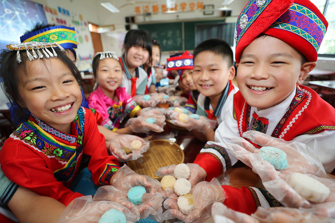 2022年9月8日,浙江省湖州市德清县武康街道东风小学开展“中秋佳节共话民族情”活动,来自汉族、彝族、壮族、畲族、布依族、苗族等多个民族的学生参加,通过做月饼、猜灯谜等互动游戏,感悟中华传统文化、增进友谊,共同迎接中秋佳节。图为多个民族的学生展示自己做的月饼。(图片来源:本文图片除标注外均综编自中新社)