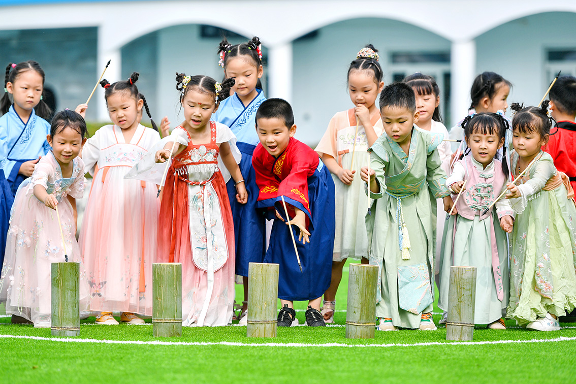 2022年9月8日,浙江省湖州市长兴县煤山镇中心幼儿园开展以“师生共品 国韵中秋”为主题的游园活动,教师和孩子们一起身着汉服,快乐参与趣味投壶、竹竿挑灯等传统民俗游戏,感悟中国传统文化和节日习俗。图为学生体验趣味投壶传统民俗游戏。