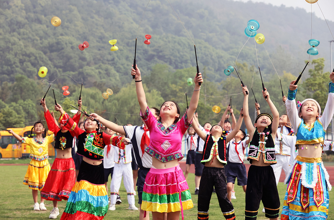 2022年9月8日,浙江省湖州市德清县乾元镇,少数民族小学生和当地同学跳花盆、抖空竹、滚铁环,喜迎中秋佳节。图为少数民族小学生和当地同学一起抖空竹。