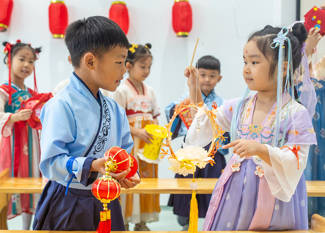 2022年9月8日,江苏省海安市七星湖幼儿园开展“多彩民俗迎中秋”主题活动,孩子们通过穿汉服、做月饼、制作花灯、学跳龙舞等方式,感受传统民俗文化,迎接中秋佳节的到来。图为孩子们在展示自制的花灯。