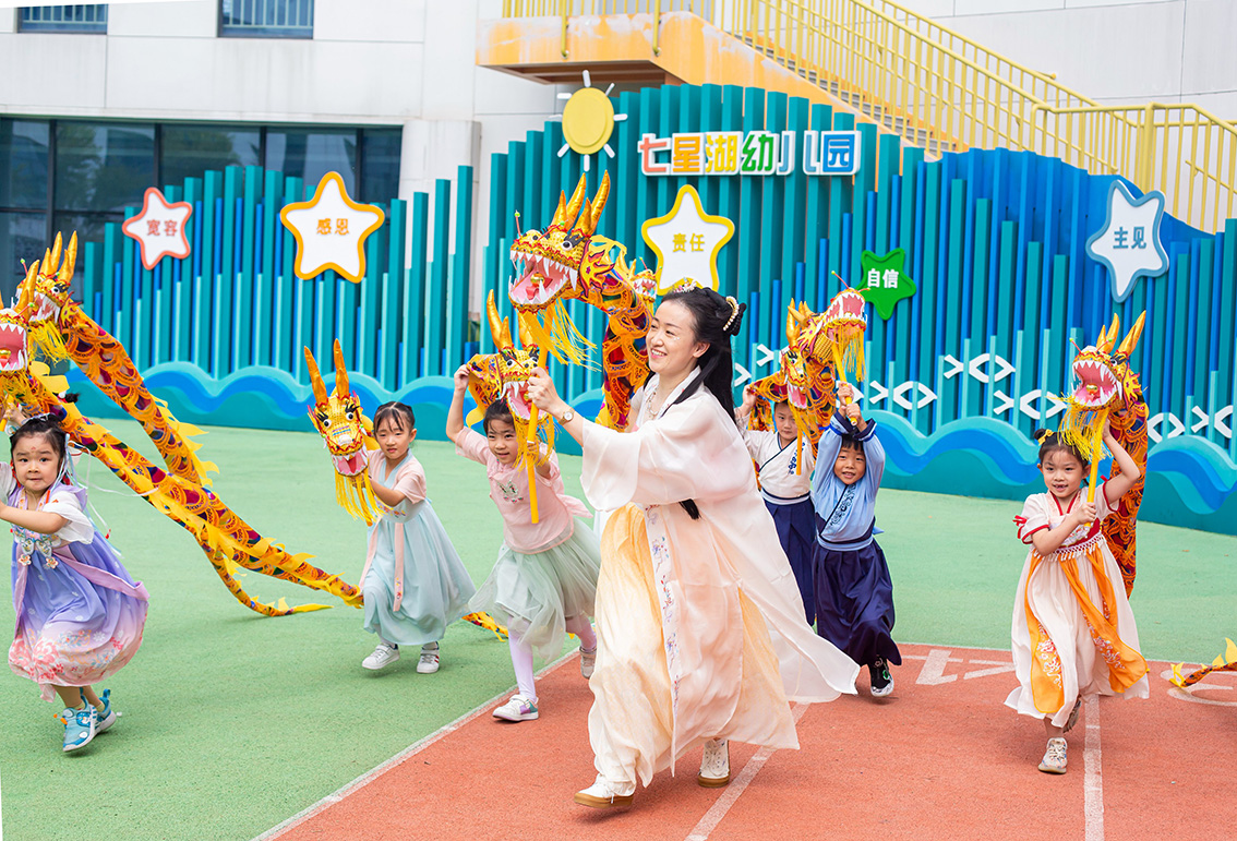 2022年9月8日,江苏省海安市七星湖幼儿园的孩子们跟着老师一起感受龙舞的魅力。