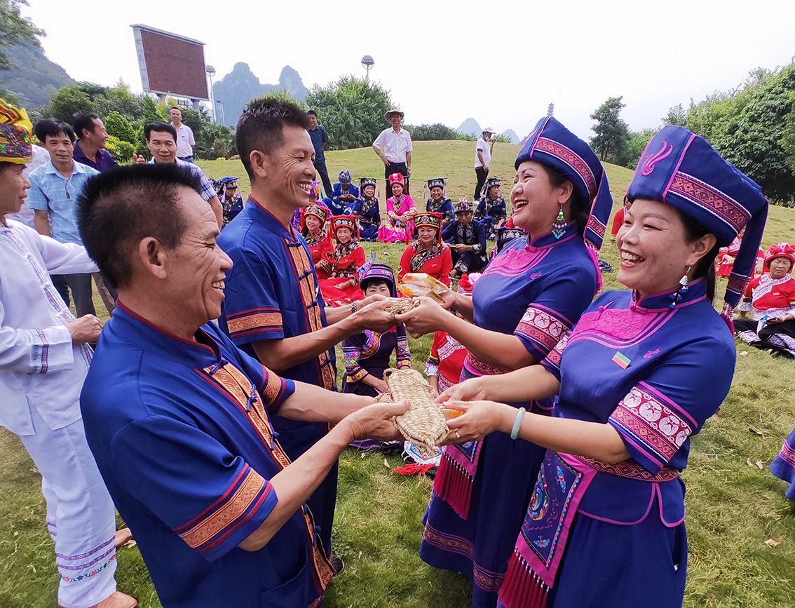 2022年9月8日,在广西罗城仫佬族自治县成龙湖公园走坡广场,山歌爱好者正在唱山歌。当日,广西罗城仫佬山乡80多名山歌爱好者们聚集在一起对唱山歌,喜迎中秋节的到来。图为山歌爱好者正在互赠月饼和同年鞋。