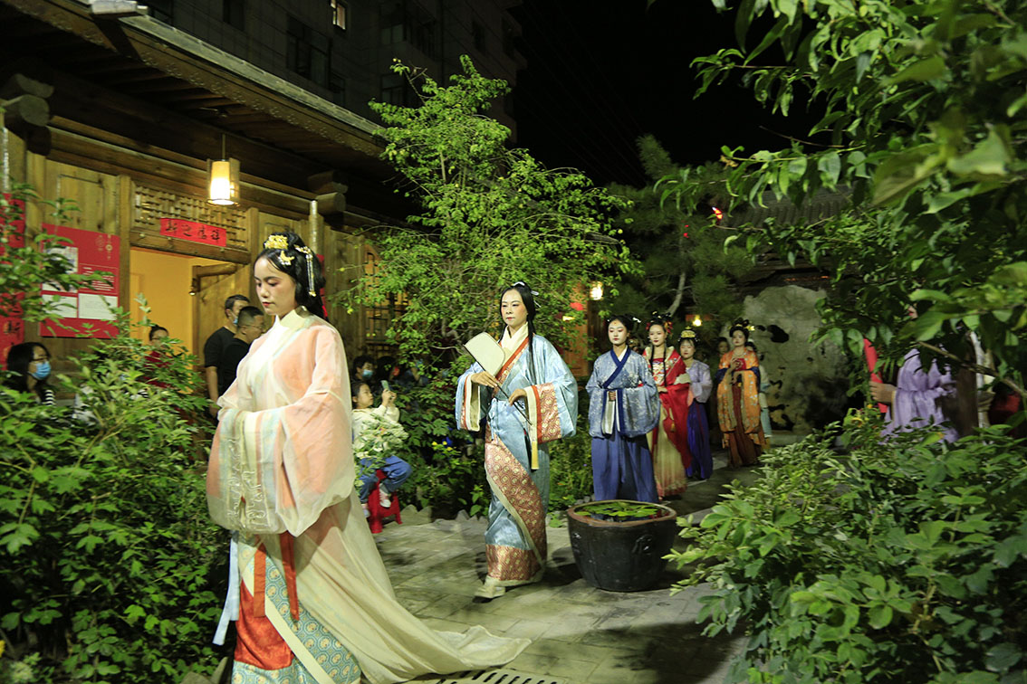 022年9月7日晚,古筝琵琶合奏《春江花月夜》在甘肃省张掖市甘州区图书馆南华书院进行。在中秋佳节临近之时,甘肃省张掖市甘州区图书馆在南华书院举办赏民俗庆中秋传统文化展演活动。图为汉、唐服饰展示在甘肃省张掖市甘州区图书馆南华书院进行。
