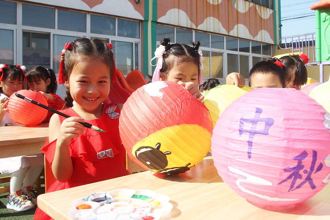 2022年9月8日,河北省唐山市丰润区七树庄镇第一中心幼儿园小朋友在绘制花灯。