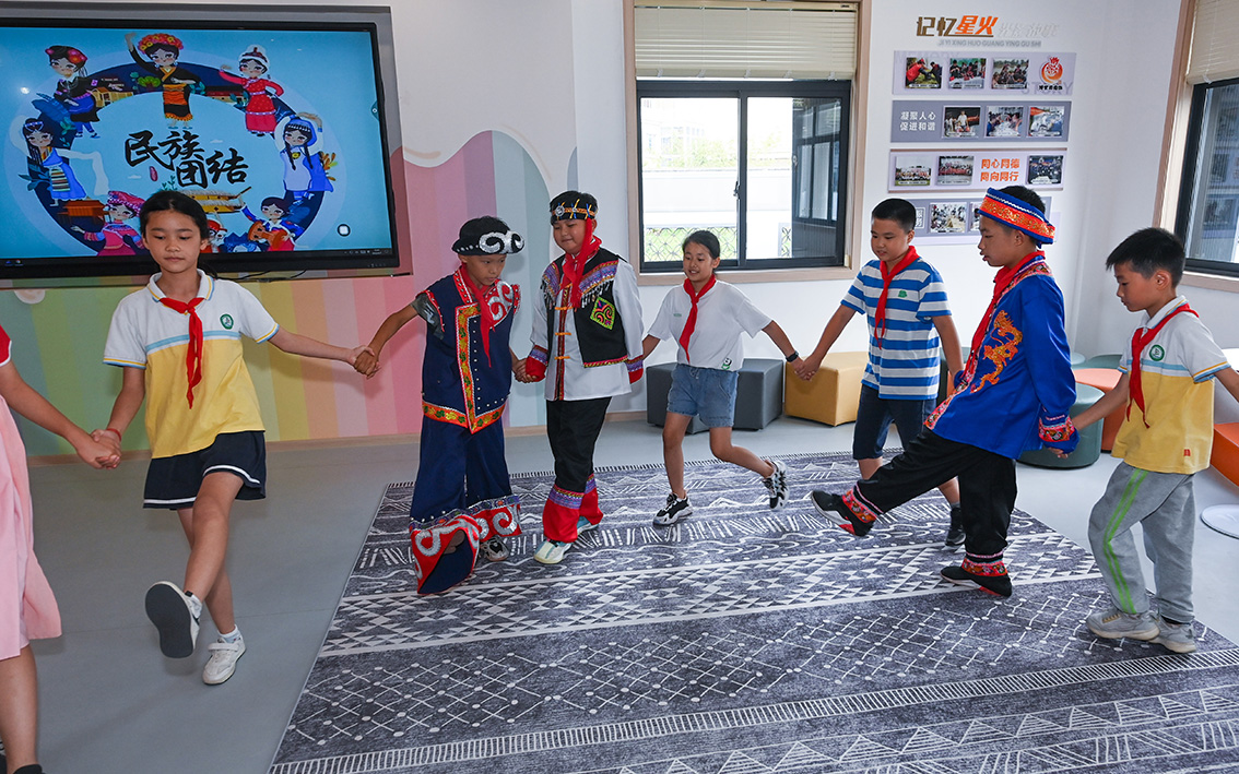 9月7日,多个民族的孩子们在东林镇星火村参加迎中秋集体舞。
