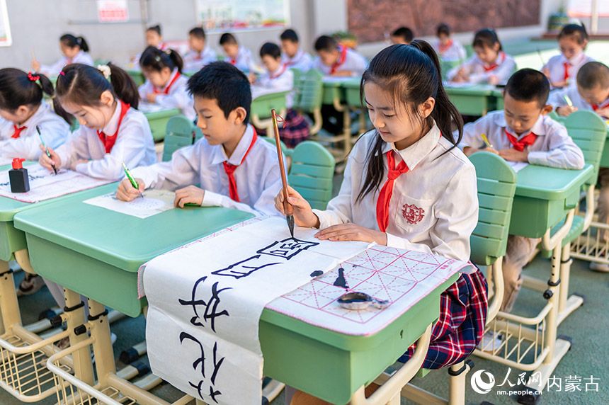 9月7日,内蒙古呼和浩特市玉泉区恒昌店巷小学学生在书写中秋诗词佳句。(图片来源:人民网)