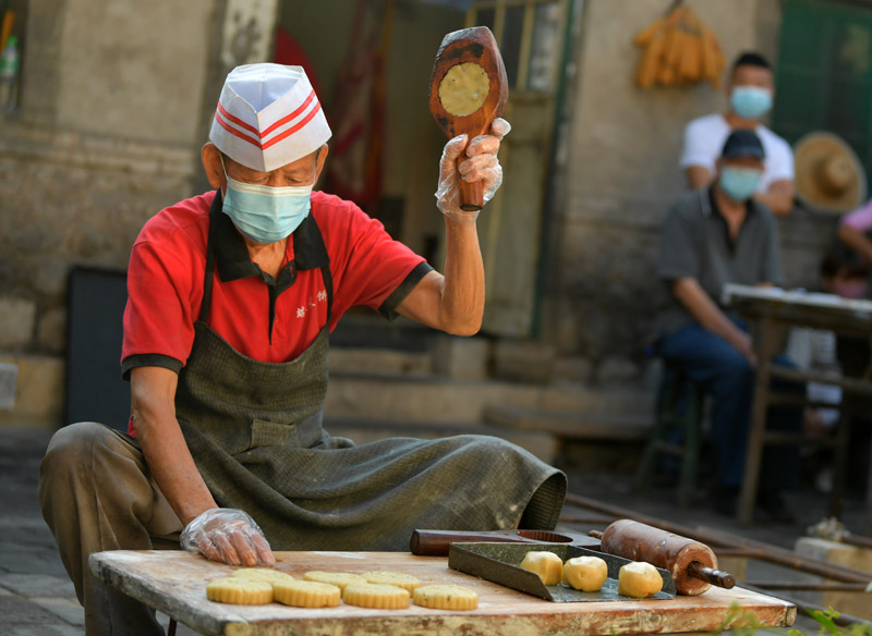随着中秋节临近,在河北省石家庄市井陉县天长镇,一家百年传统手工月饼作坊里,工人们正在打制月饼。天长镇历史悠久,于2008年入选第四批中国历史文化名镇。据该手工月饼作坊主于银柱老人介绍,这门手艺已传承六代人,每一道工序都是纯手工完成,他们制作月饼的定碗、水缸、铁盆、走槌木模模具等也沿用至今。图为9月6日,于银柱使用传统模具制作月饼。(图片来源:中新社)