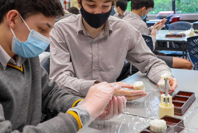 9月5日,在新西兰惠灵顿男子中学,参加中文课堂的学生制作冰皮月饼。(图片来源:新华社)