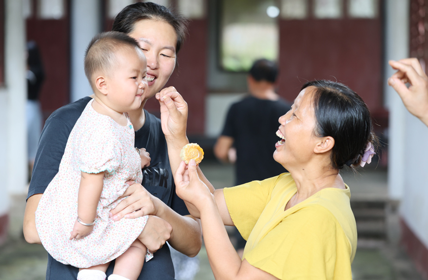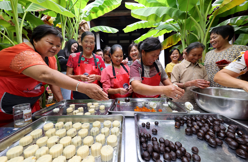 9月8日,江西省抚州市东乡区黎圩镇枫山村,村民们在一起进行“自制月饼意更浓中秋情暖老人心”喜迎中秋活动。(图片来源:人民网)