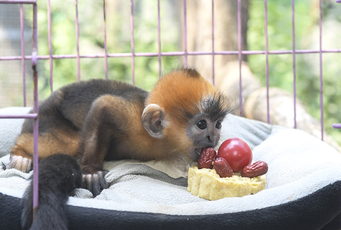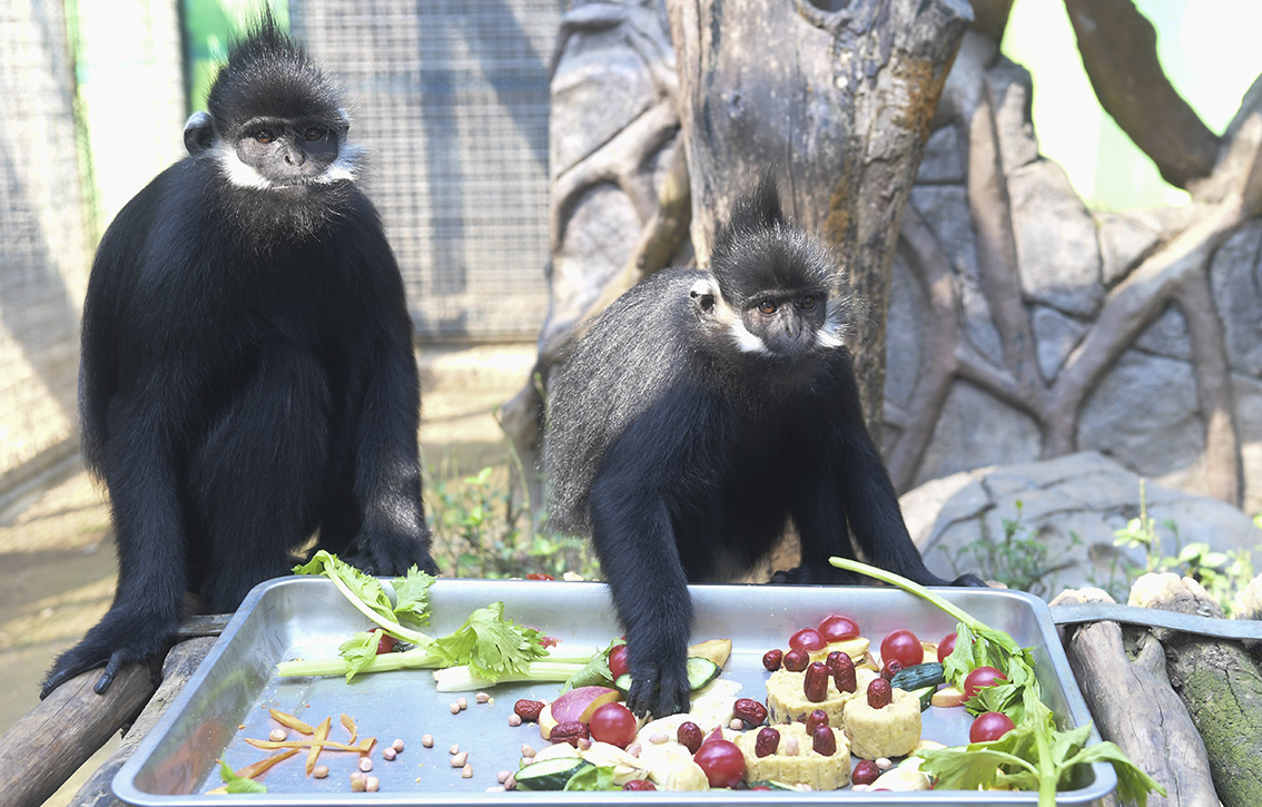 9月10日,山东济南,黑叶猴享用特制“月饼”。