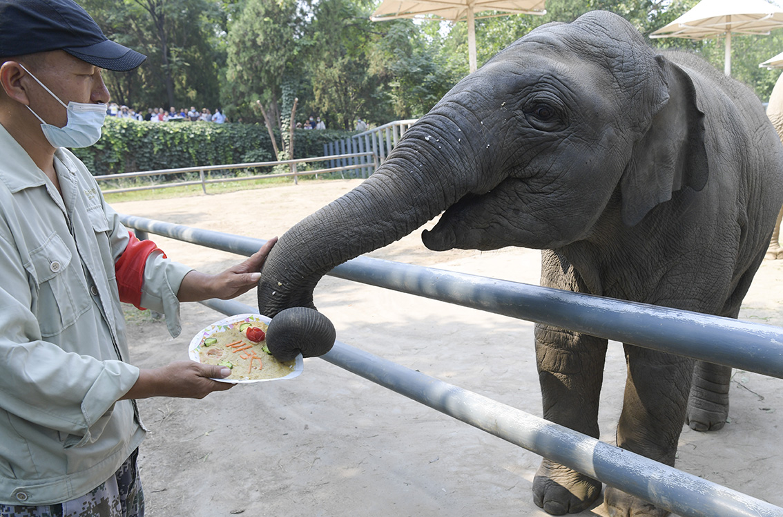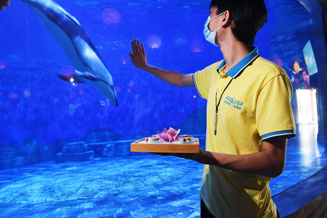 9月6日,在重庆汉海海洋公园内,饲养员端着一盘为动物们准备的“月饼”。