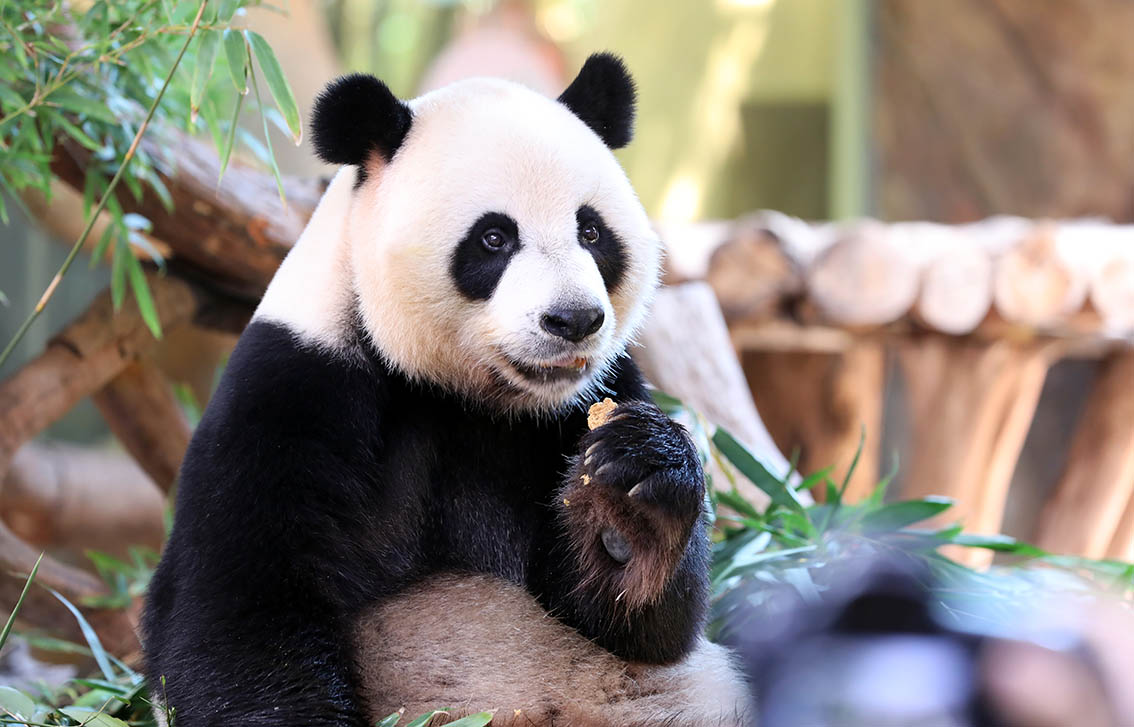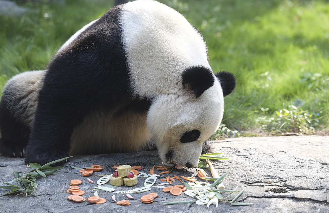 9月10日,山东济南,大熊猫享用特制“月饼”。