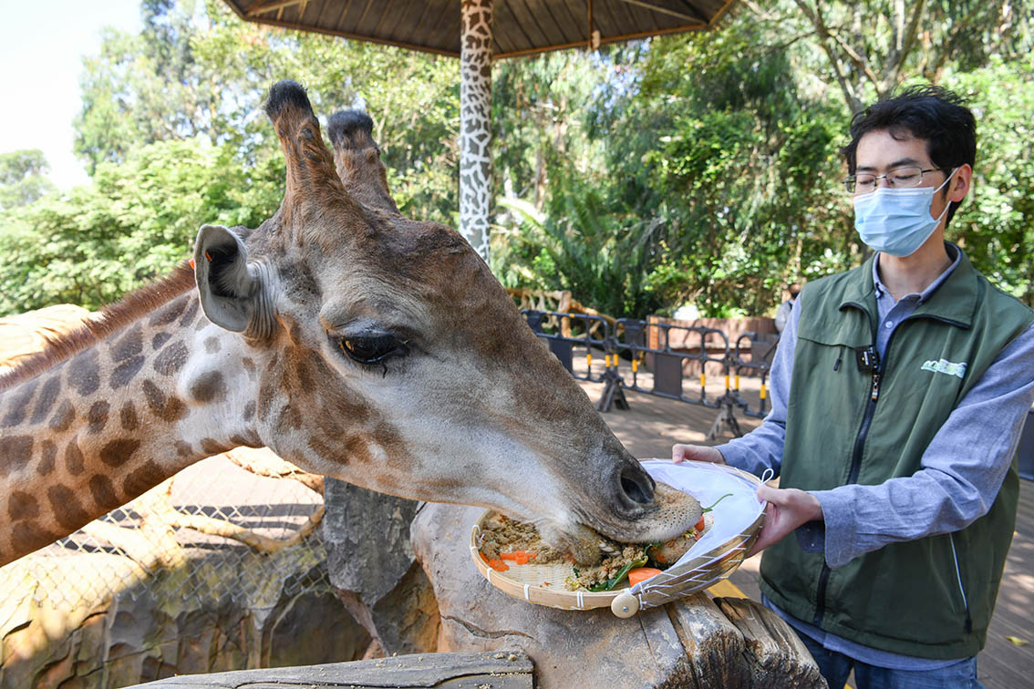 9月7日,云南昆明,云南野生动物园工作人员根据动物们的食性,采用不同的食材为动物们准备“特制月饼”。图为长颈鹿享用“特制月饼”。