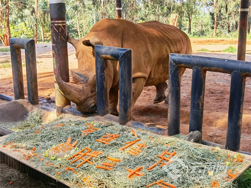 9月7日,云南昆明,犀牛吃精饲料制作的巨型“月饼” 。(图片来源:云南网)