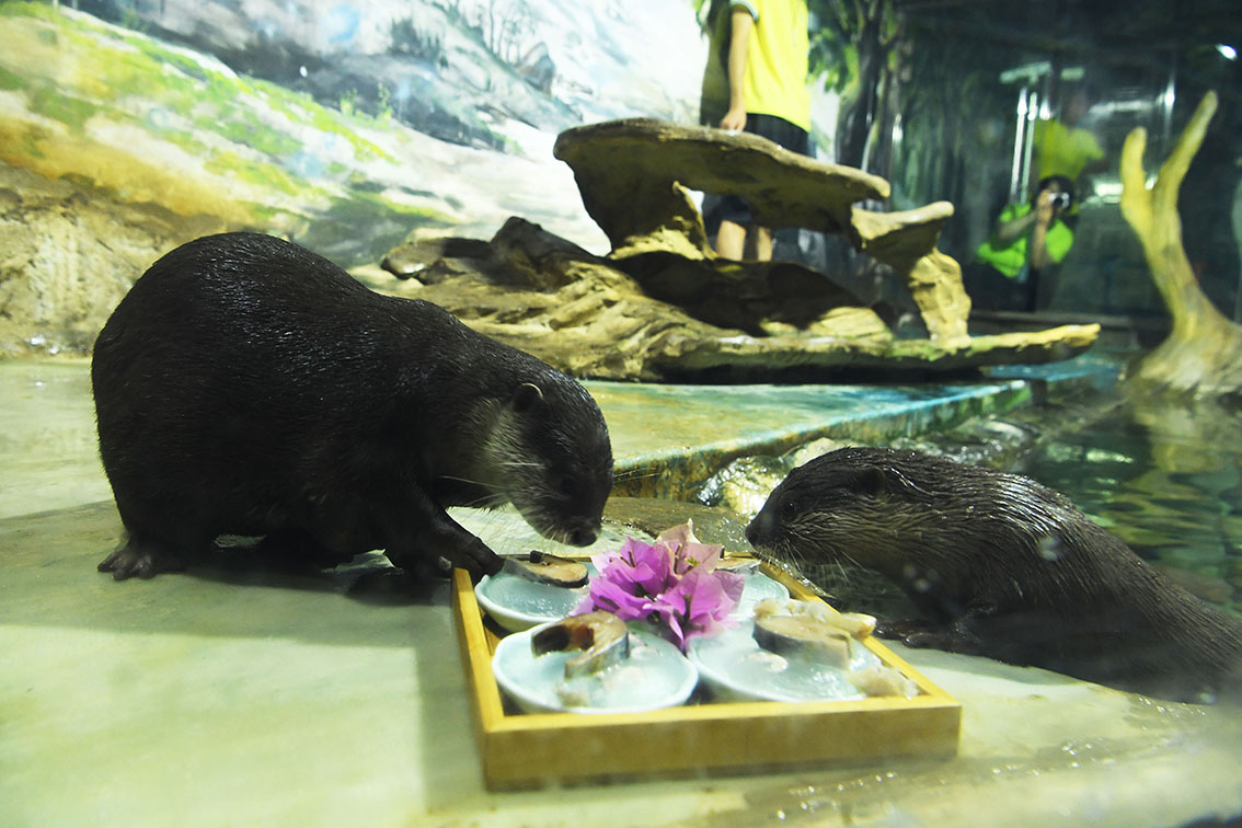 9月6日,在重庆汉海海洋公园内,饲养员利用鱼肉和白凉粉作为食材,为海狮、水獭、海豚等动物制作了一种特殊“月饼”。图为水獭正在品尝“月饼”。