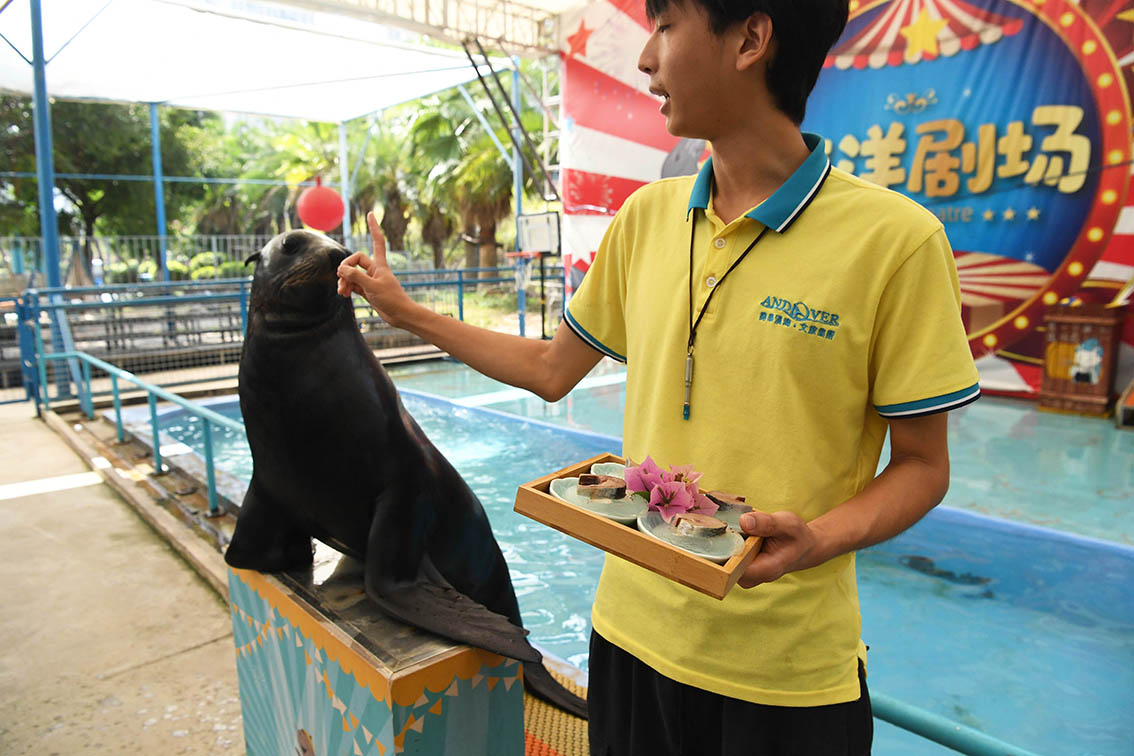9月6日,在重庆汉海海洋公园内,饲养员给海狮吃“月饼”。