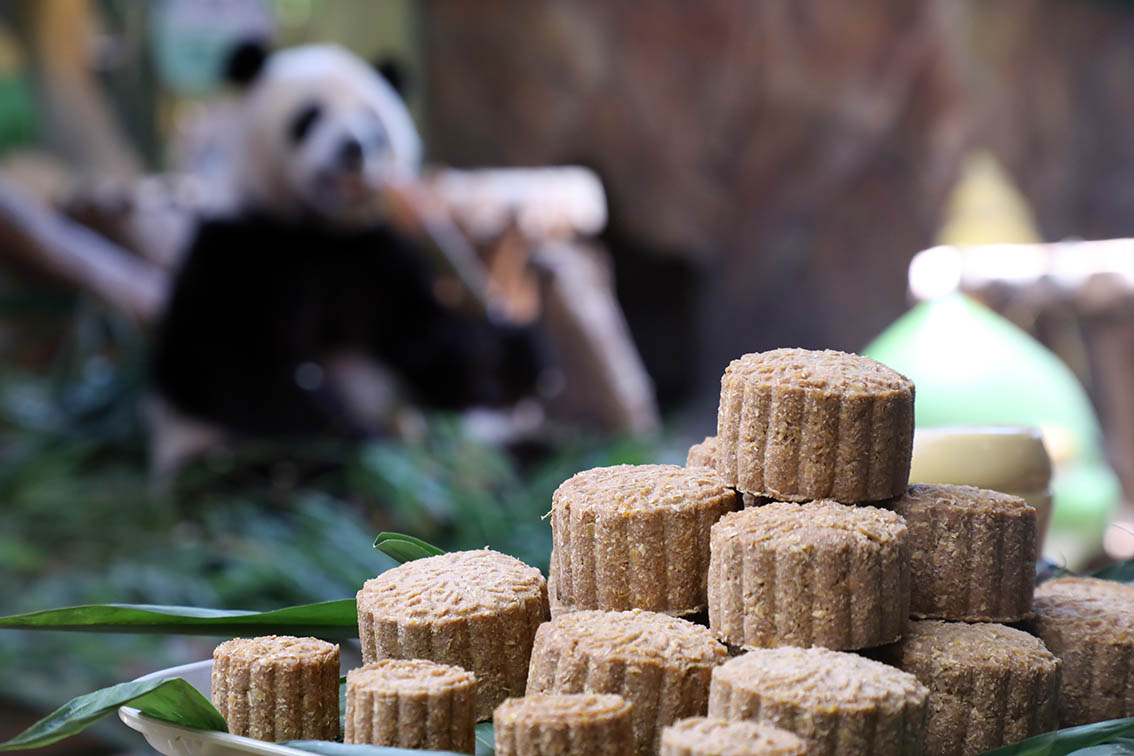 9月9日拍摄的广州长隆野生动物世界工作人员为大熊猫准备的“月饼”。大熊猫“月饼”的食材包括竹笋、水果等大熊猫喜爱的食物。(图片来源:新华社)