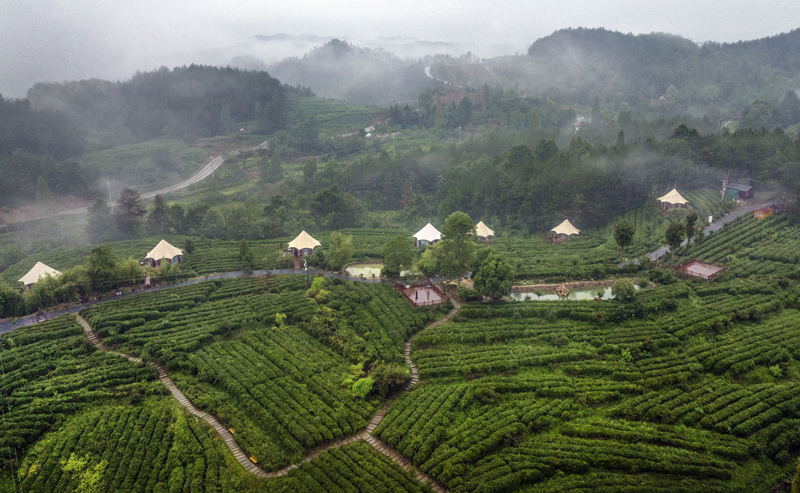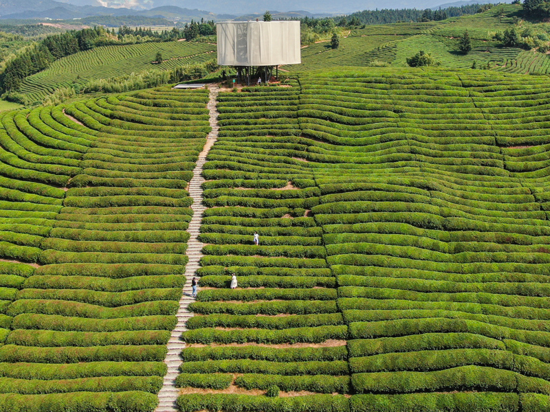 9月7日,游人在地处秦巴山区的陕西省汉中市宁强县千山茶园参观(无人机照片)。(图片来源:新华社)